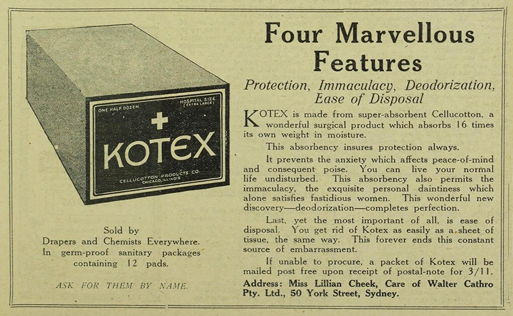 This quiet approach continued into the 1940s where Dr Connory found ads that cryptically apologised to women for pad shortages, as the raw materials for bandages and medical necessities had to be prioritised for the war effort.