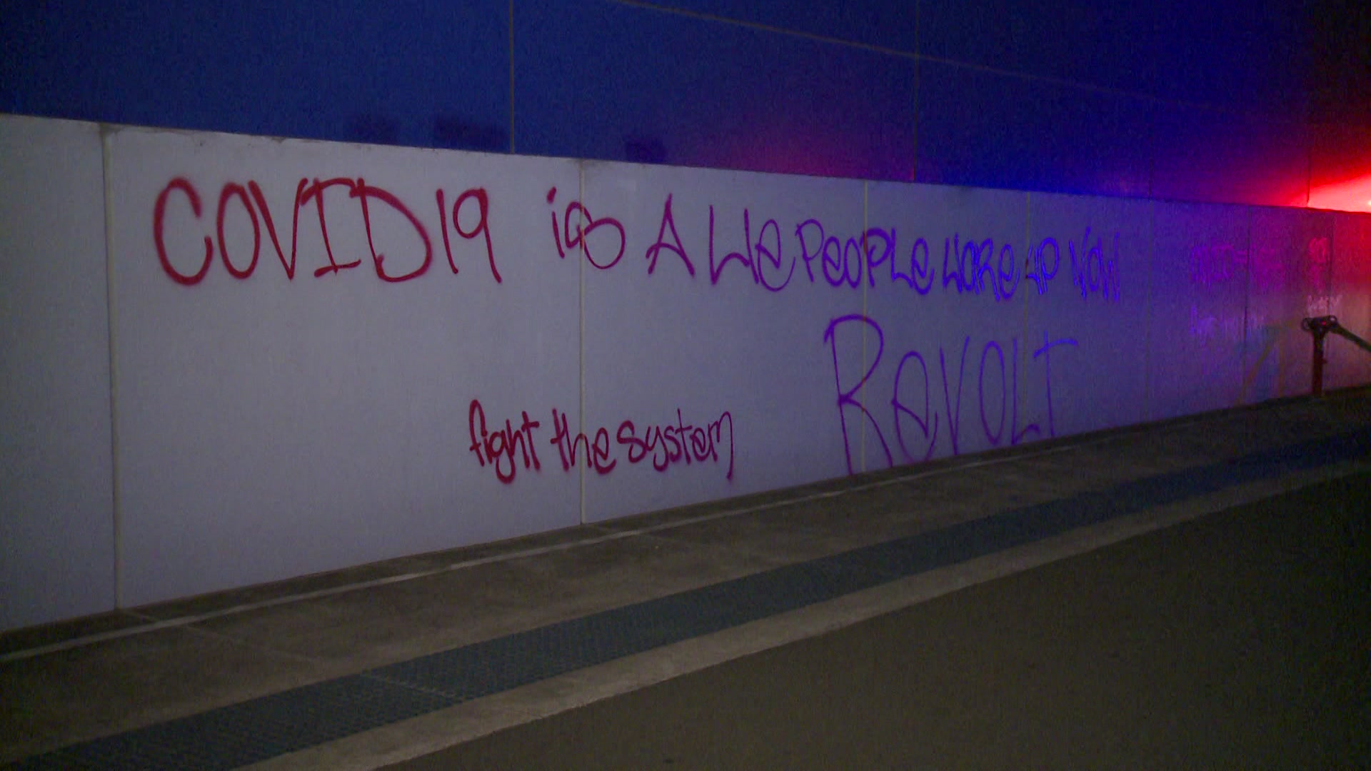 Some of the graffiti read: "COVID-19 is a lie. People wake up now. Fight the system. Revolt.