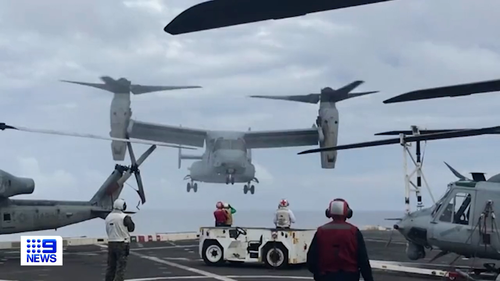 The video shows personnel in the military helicopter, the MV-22 Osprey, attempting a landing on a ship off the coast of Rockhampton in 2017 - when the aircraft falters and nose dives towards the deck.