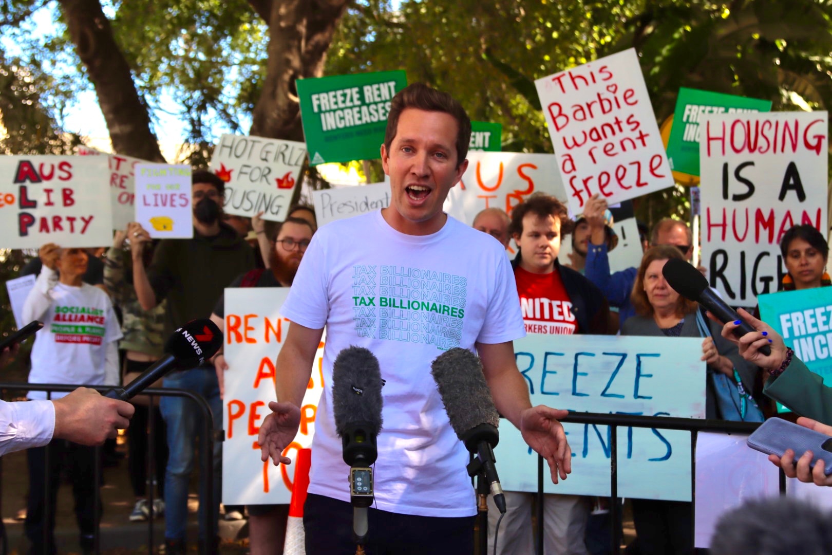 Renters "won't forgive" Labor for failing to bring in a rent cap, Greens MP Max Chandler-Mather has told hundreds of protesters at the ALP's national conference in Brisbane.