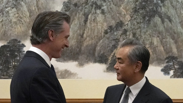 California Gov. Gavin Newsom, left, shakes hands with Chinese Foreign Minister Wang Yi during a meeting at the Diaoyutai State Guest House in Beijing, Wednesday. AP