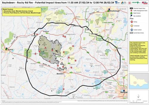A Watch and Act alert remains in place for Amphitheatre, Bayindeen, Ben Nevis, Chute, Elmhurst, Eversley, Glenlogie, Glenpatrick, Mount Cole, Mount Lonarch, Main Lead, Waterloo and Raglan.