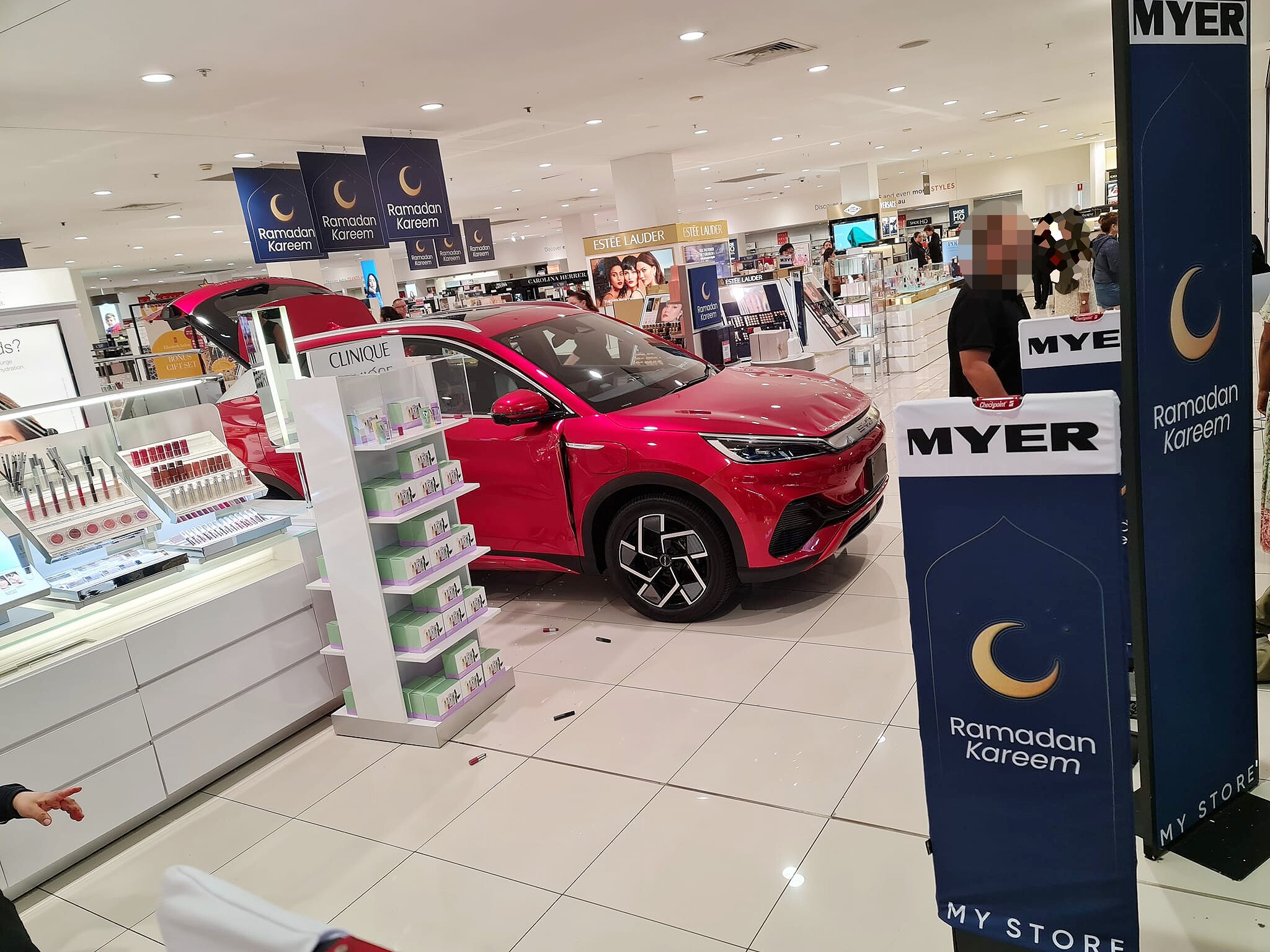 Images of the scene show the vehicle after the incident parked alongside a beauty counter at Myer.